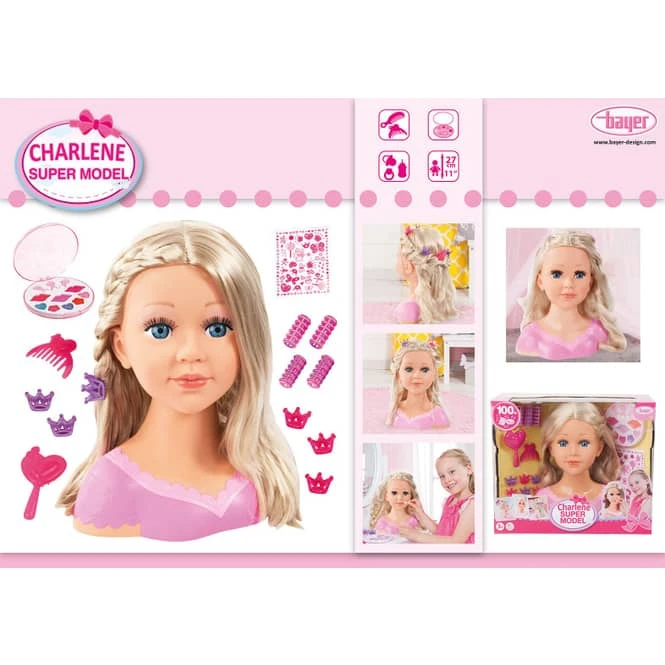Mit dem Charlene Super Model Schmink- und Frisierkopf kann so gut wie jede Styling-Idee umgesetzt werden. Mit der im Set enthaltenen Bürste, Kamm, Klammern und Lockenwickler lassen sich unzählige unterschiedliche Frisuren kreieren. Tolle Haarstylingideen sind auch auf der Verpackung abgebildet.