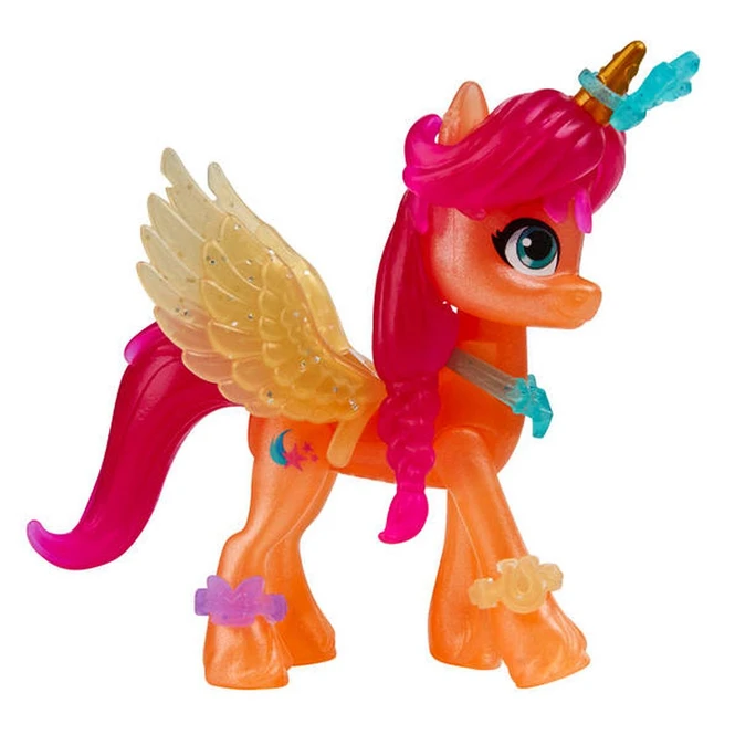 Die Farbenspiel-Laterne enthält eine 7,5 cm große Sunny Starscout Ponyfigur mit einem Schönheitsfleck in Form einer Sternschnuppe auf einer Flanke, der von ihrem Charakter inspiriert ist. Die Figur ist beweglich und hat geformte pinke Haare, die zu ihrem bekannten Zopf geflochten sind. Wird der Schlüssel an der Laterne gedreht, beginnt sie zu leuchten und es erscheinen kleine Kristallbehälter. In jedem kleinen Behälter sowie oben auf der Laterne versteckt sich ein Überraschungsaccessoire! Werden die Kristallteile über das Licht in der Laterne platziert, verändert sich die Lichtfarbe (insgesamt 6 verschiedenen Farben)!