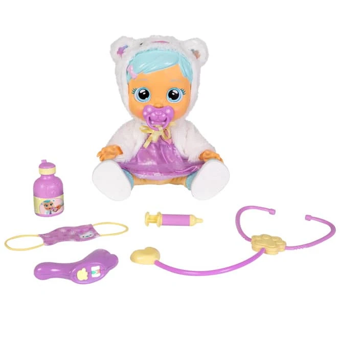 Vor allem jetzt braucht sie besonders viel Liebe und Fürsorge. Ist ihrSchnuller weg, beginnt sie zu jammern, gibt schluchzende Laute von sich und weint große Kullertränen –fast wie ein echtes Baby. Um wieder gesund zu werden, braucht sie schnell die richtige Medizin und ausgiebige Kuscheleinheiten. Gibt man ihr den Schnuller, hört sie auf zu weinen. Wenn Kristal fröstelt und niest, findet man mit dem Thermometer schnell heraus, ob sie Fieber hat. Ihr starker Husten wird am besten mit Hustensaft behandelt. Das Stethoskop überprüft den Herzschlag und zur Sicherheit sollte Kristal, solange sie krank ist, eine Mund-Nasen-Maske tragen. Oh nein, wo kommen nur die roten Punkte in Kristals Gesicht her? Jetzt heißt es Spritze geben. Super gemacht! Diese süße Cry Babies Puppe trägt putzige, ausziehbare Kleidung mit einem kuscheligen Mantel und Schuhen. Mit insgesamt 11 Sounds und den verschiedenen Krankheitssymptomen, bleibt es mit Kristal immer spannend.