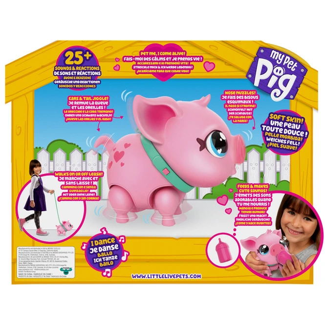 Mit über 25 Geräuschen und Reaktionen ist Piggly das süßeste Haustier! Sie bewegt sich und klingt wie ein echtes Schwein! Füttere sie mit ihrer Flasche und und streichle sie, während sie auf deine Berührungen reagiert. Ihre Nase schnuppert und schnüffelt beim Kuscheln. Füttere sie mit der Flasche und sie macht niedliche Fütterungsgeräusche.