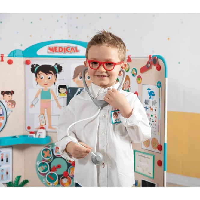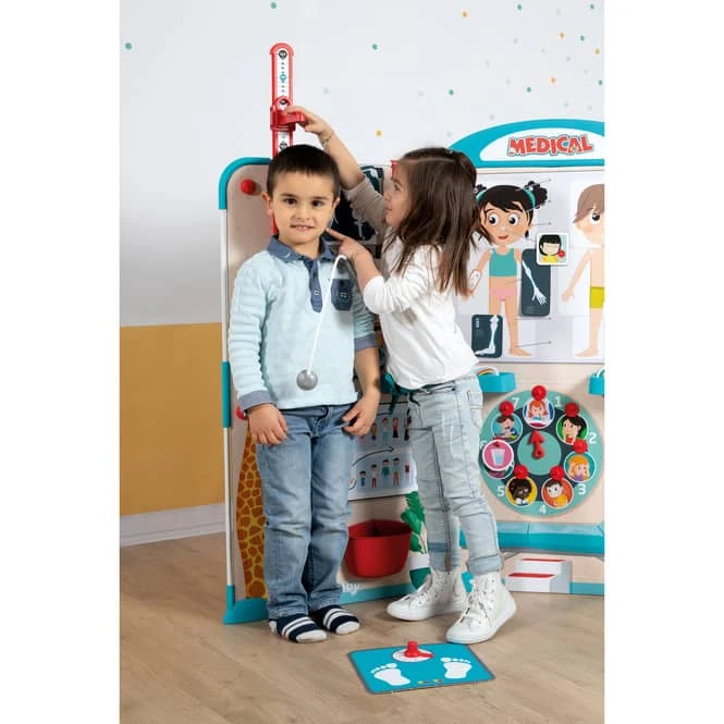 Die Smoby Kinderarztpraxis besteht aus drei Flügeln aus hochwertigen Karton-Teilen, die von einem stabilen Metallrahmen eingefasst werden. Die integrierten Regale geben zusätzliche Stabilität und bieten viel Platz für das umfangreiche Untersuchungszubehör. Nach dem Spielen lässt sich die Praxis wieder platzsparend zusammenlegen und verräumen.