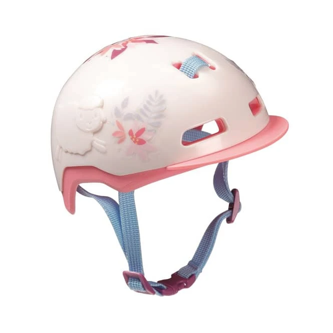 Safety first! Natürlich steht bei der Fahrradtour mit Baby Annabell Sicherheit an erster Stelle. Im Fahrradsitz wird sie gut angeschnallt und bekommt ihren Fahrradhelm auf. Der weiße Helm mit dem ausgeformten Schäfchen an der Seite und dem originellen rosa Windschild schützt Baby Annabells Köpfchen. Durch die blauen Riemen sitzt er perfekt und verrutscht auch nicht, wenn es mal über Stock und Stein geht. Die Schließriemen können verstellt werden, so dass Sophia den Helm ebenfalls tragen kann. Die elegante Kopfbedeckung ist mit einem tollen Blumenmuster bedruckt. Baby Annabells Antrieb läuft nämlich mit Flower Power.
