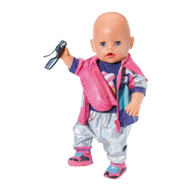„Trööööötttt!“ Das war die Starthupe zur Tour de BABY born. Die kleine Rennfahrerin hat ein besonders cooles Trikot. Ihre Kapuzenjacke ist im top aktuellen Geo-Shape-Style designed. Die geometrischen Formen sind auch in der Sonnenbrille zu finden. Darunter passt hervorragend das dunkle Shirt mit Bär Brunos Konterfei. Über den sportlichen Schuhen trägt sie eine silberne Hose, die im Sonnenlicht schimmert, wie eine Medaille. Die Wettkampfunterlagen und einen Energiebrei für den kleinen Hunger zwischendurch verstaut sie in der pinken Gürteltasche.
